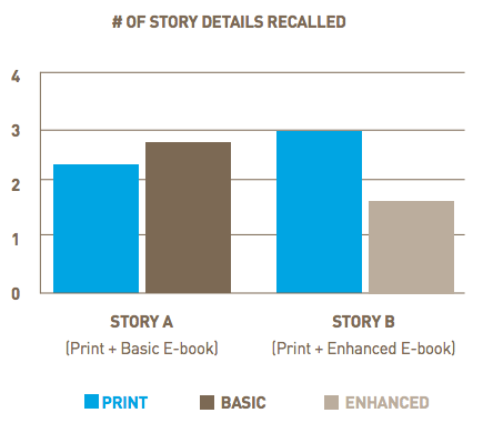Similar results were found by a small study by the Joan Ganz Cooney Center that consisted of 32 kids reading e-books and print books with their parents. It found that “enhanced” e-books might be distracting. Kids who read enhanced e-books—ones with interactive, multimedia experiences—were more engaged with them physically, but in the end they remembered fewer narrative details than those who read print books or basic e-books [PDF].