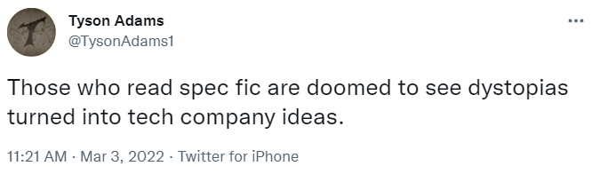 This idea of how the “big brains” in Silicon Valley seem to miss the point of most speculative fiction has been in my thoughts lately. I’ve lost count of the number of articles I’ve read that have sung the praises of a new tech idea that was clearly ripped straight out of a dystopic novel.