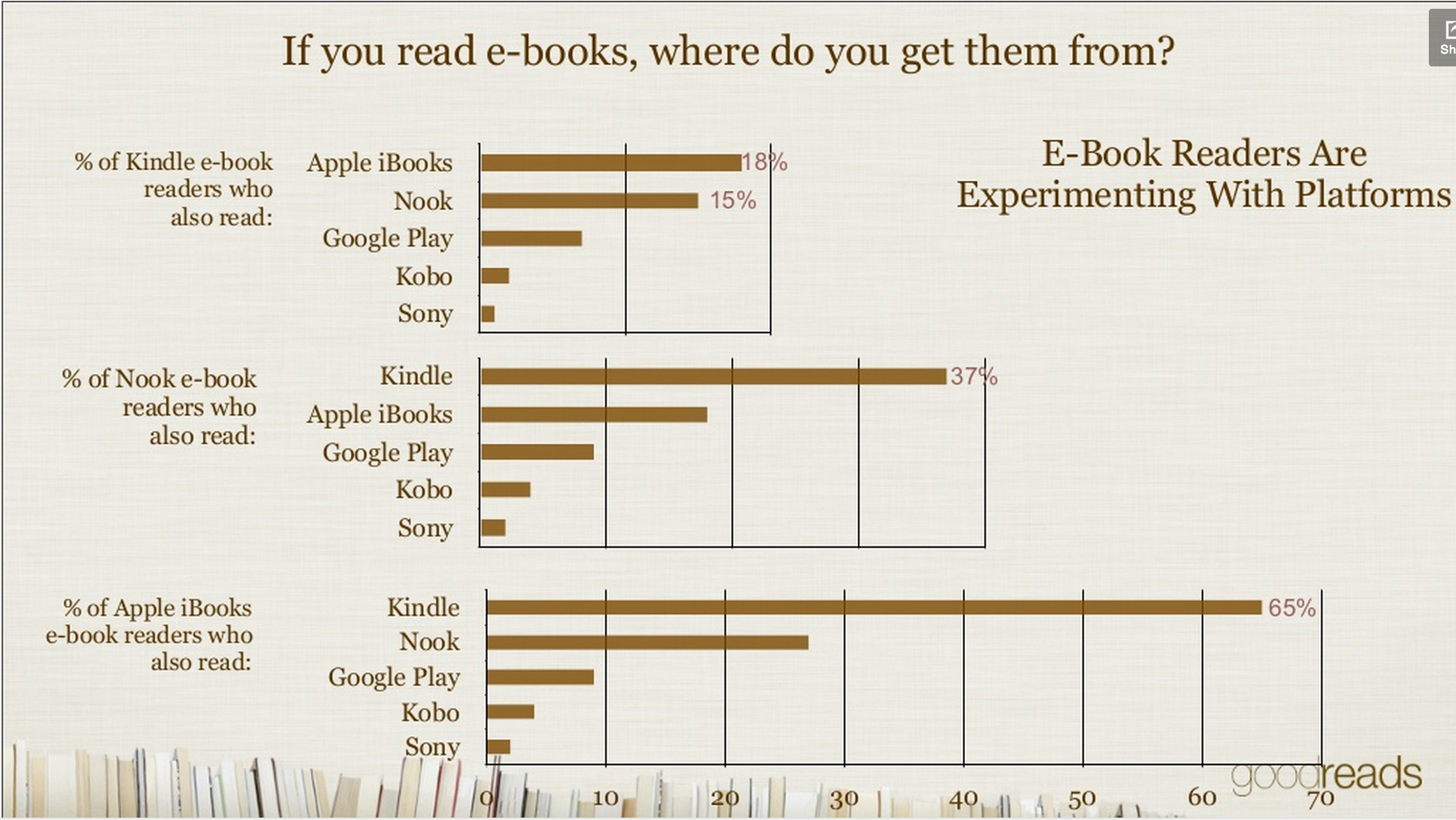 Of course, I don’t think anyone is particularly surprised by this decision. Raise your hand if you’ve ever actually seen a Sony e-reader. Now keep it up if you’ve actually owned one. If you can see anyone with their hand still raised, I’d question how you manage to turn people’s web cams on. Sony has been playing at the bottom end of the market for e-readers and e-books for quite a while now. The chart below from Goodreads shows Sony were picking up Kobo’s scraps in the market.