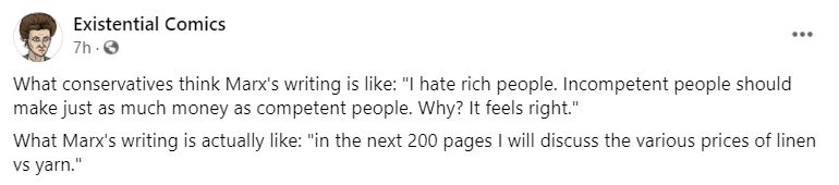 Since it has become popular to call anyone left of a third-generation venture capitalist with their cash in the Caymans and their Nazi gold in a Swiss vault a communist, I thought it was time to read some Marx. That way when people call someone a Post-Modern Marxist Communist I’ll have some idea of how little they know what any of those words mean.