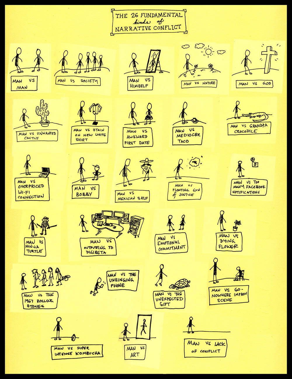Every work of literature, and much nonfiction narrative, is based on at least one of the following conflicts. When you write a story or a biography, or relate a true event or series of events, you need not focus on such themes, and there’s no reason to state them explicitly (except in passing, perhaps, to provide insight about a biographical subject), but you’re wise to identify the conflicts inherent in your composition and apply them as you write.